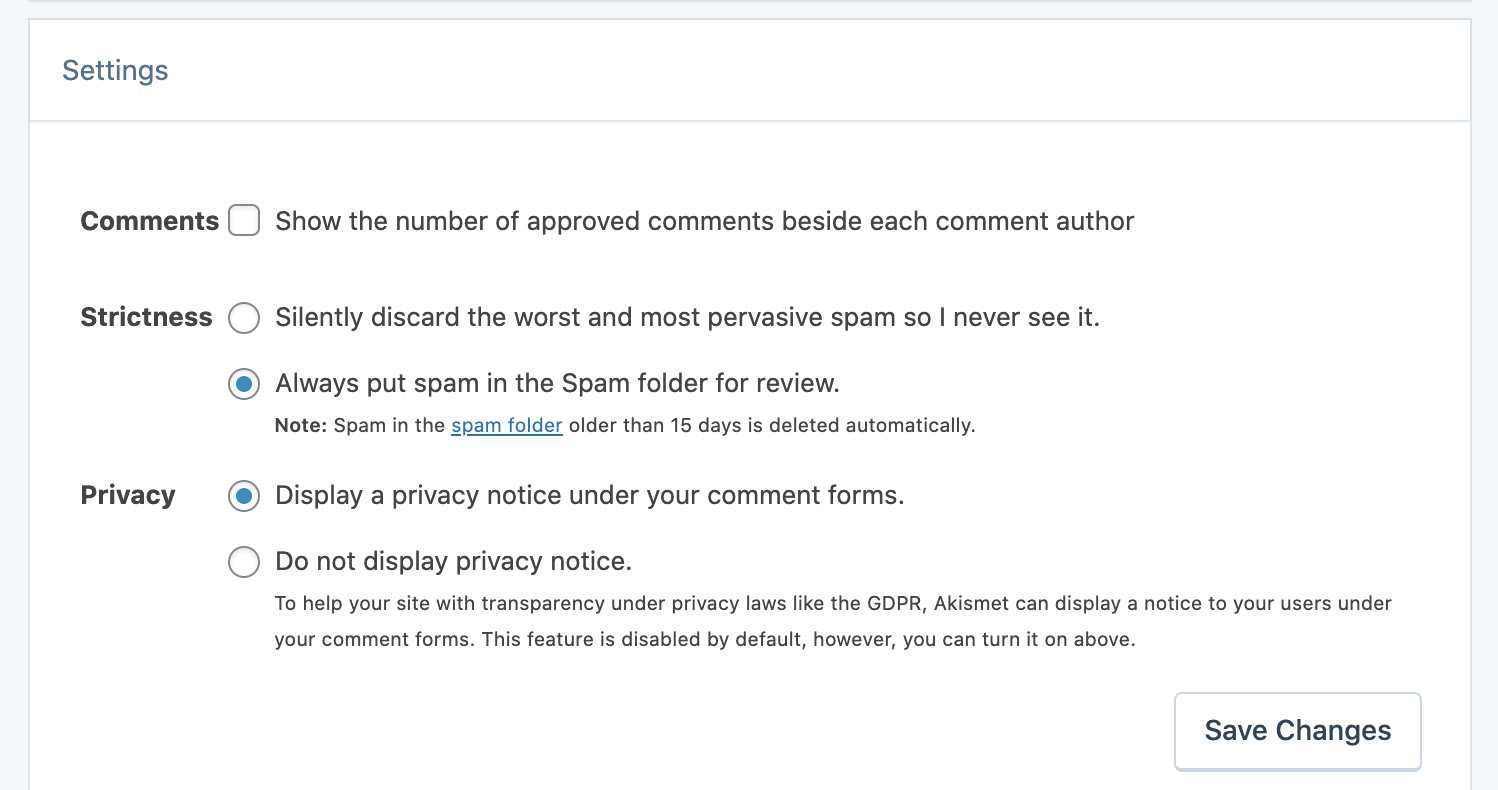 Note that once the constant is configured, the text field in the Akismet settings screen where one would normally enter the API key will no longer be displayed.